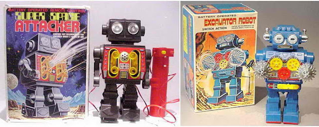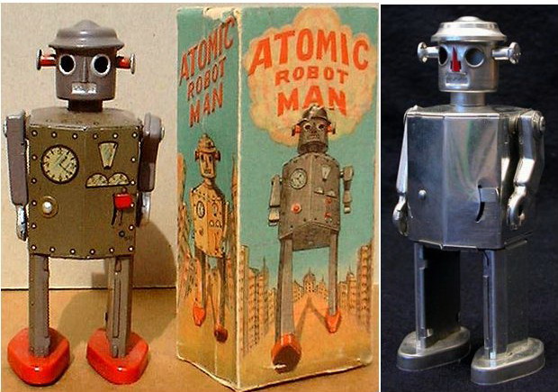 Na década de cinquenta (50’s), os robôs, naves e estações espaciais de chapa litografada eram vendidos por todo o mundo (representavam 60% do total de brinquedos exportados), com centenas de figuras, variações e cores diferentes, (dando asas á imaginação das crianças que sonhavam quase todas em vir a ser astronautas), e beneficiaram de várias evoluções, principalmente com a motorização (enquanto as pilhas já eram usadas em brinquedos mas apenas para funções de luz e som, os fabricantes Japoneses começaram a usá-las ligados a pequenos motores para articulação e locomoção). Como curiosidade, a propósito do segundo robô conhecido Atomic Robot Man, e que apareceu nos E.U.A. na New York Sci-Fi Convention de 1950, irónicamente a caixa mostrava a todos uma imagem do robô marchando no meio de uma cidade em ruínas e um cogumelo de bomba atómica como fundo...